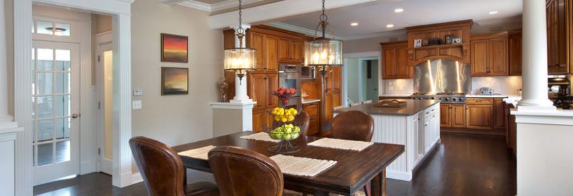Kitchen Eating Area We added a coffered ceiling to delineate the dining space, and columned walls to create a transition into the kitchen. With young boys in the house, we selected leather chairs and a rugged farm style table to make life easier on mom and dad. The pre-existing rug was worked in. Note the […]