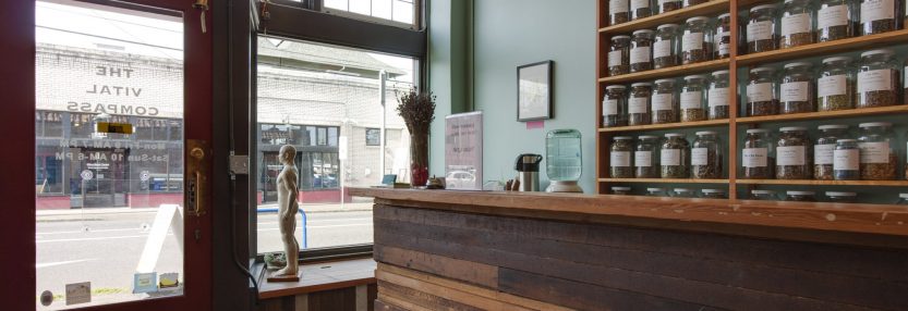 The healing space boasts tall ceilings and well-defined areas for physician/patient intake, exam/treatment zone, storage, and specialty tea offerings.