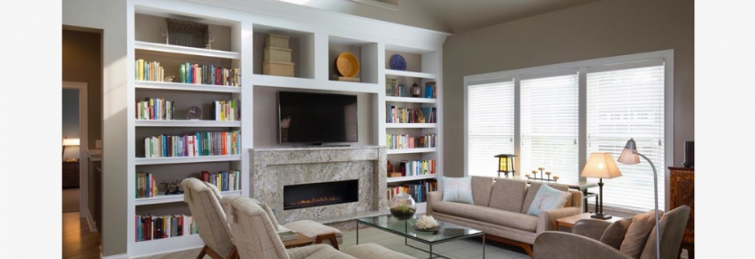 Cincinnati Project Built-in bookcase and fireplace are the focal point for the Living Room in taupe and soft green