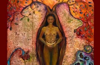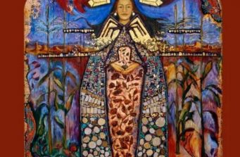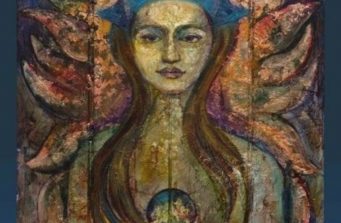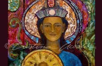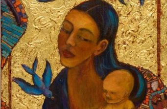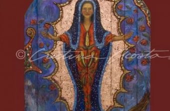 The Guadalupe cradles her child. She is surrounded by the Holy Spirit, symbolized by birds orbiting the central sphere of crystals. The encaustic background is incised with a pattern of roses and covered in 22kt. gold leaf. She is the intimate Madonna.