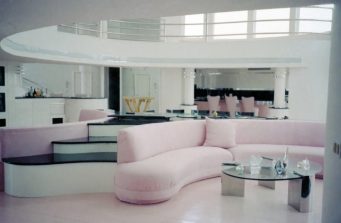 Designed in the Art Moderne style in collaboration with the owners for easy living this was an amazing beachfront compound in Sagaponak, NY. Built around 1985 innovations included sophisticated lighting and sound systems and multi-faceted security system. All aspects for the design of the interior and exterior were addressed. Accented with antiques and art the customized furniture included a multi-media TV and movie system, cocktail tables, motorized furniture and lighting. In the center of the main living space a projector raised from the central seating area and a screen dropped for movies.
