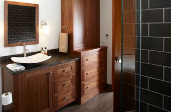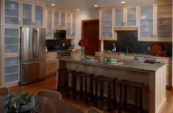 Custom kitchen design, custom-built maple cabinets, carbonized bamboo floor, granite countertops, subway tile and custom-built walnut counter stools
