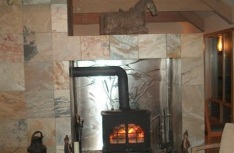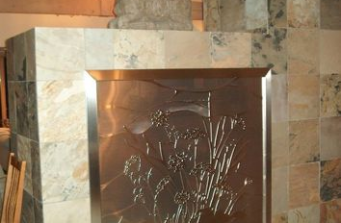 Custom laser cut fireplace screen, five feet by five feet, aluminum with stainless frame. Allows art in an architectural element while providing a screen to the back of a wood burning stove. A pin dot layer of aluminum is used between two mirror images of custom cut original graphics to allow the panel to be seen through without complete openness.