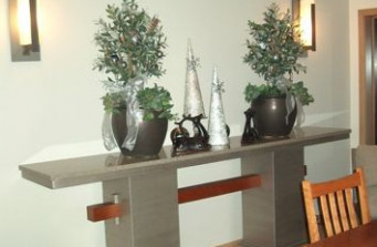 Custom Altar table for the dining area with brushed aluminum columns, a quartz top and cherry post to tie this in with an existing custom cherry table and chairs.