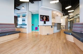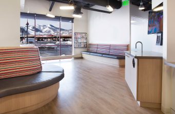 M2O is the fourth collaboration between VA-Spaces and Dr.’s Robert and Juliana Miller. A recent move to Park City, UT created the need for a unique space which would stand out in the community. Park City is renowned for its winter beauty and it was with that beauty in mind that the examination chairs were centered in clear view of the US Olympic Slalom jump. A combination of bright, exciting color was paired with rustic elements to match Utah’s natural beauty. The color and theme paired with extensive use of glass lends the space a true feeling of community, warmth, and fun.