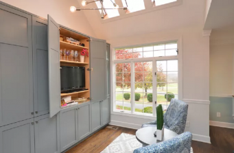 The dining room had a wall separating it from the eat in kitchen area, and a 30″ door as opposed to a large archway. The kitchen was an island, with small traditional cabinet and plate rails on top. The whole back wall is storage. The grey wall in the kitchen next to the white cabinets are recessed cabinets. They are recessed into the connecting laundry room. This prevented having to take up precious realty by having a counter and cabinets in the kitchen side. It also having to take the wall down and back up again. The butcher block was an antique block table. The legs were taken off to be used in a different project, and the block integrated into the counter.