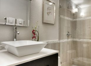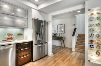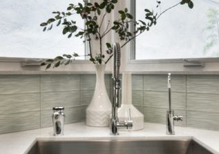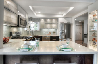 Kitchen remodel – complete demo of kitchen built in 1975. Removed wall to open up space to appreciate waterfront view. Raised the ceiling, utilized support beam to design custom display cabinet, updated all surfaces, backsplash, cabinets, appliances, lighting and fixtures.