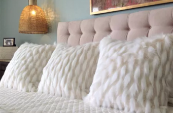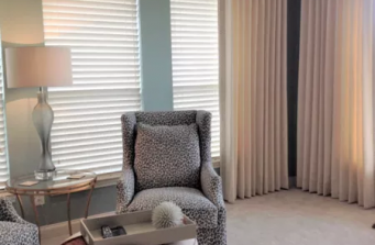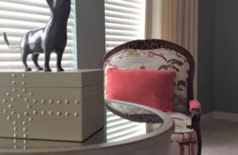 This is a large upstairs master bedroom retreat. Our challenge was to work with 2 walls of windows and keep the existing paint color. Each window wall was treated as a single window utilizing double width drapery panels with acrylic hardware. Fur elements and a tufted bed were included to add a plush softness to the room. We included a writing desk and chair as well as a seating area for tv viewing. Pendant lights free up the generous night chests and add sparkle to the space, and a lovely oversized abstract art piece adds color and character. Beautiful lamps echo the soft teal and add ambient lighting, And Beau, the kitty cat, is very happy with this space!