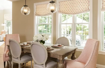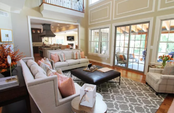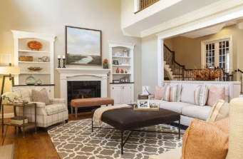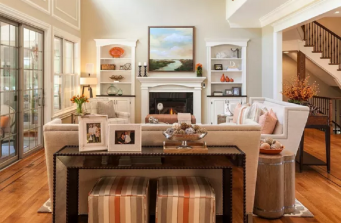 So many pops of orange make this space incredibly warm and welcoming. The feel of the space when you stand in it is bright with charm. The orange is picked up in the accessories and drapes in the den area, then softened into a coral color in the living room. White trim brings just the right touch against the warm beige walls.