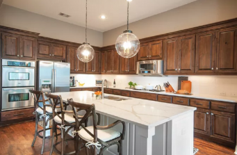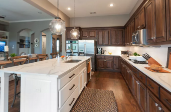 This house has an open floor plan. Flow is incredibly important with an open floor plan and can be tricky to get just right. The flow from the kitchen to the breakfast area, living room and dining room makes transitions from one room to other seamless and inviting. The mix of wood tones is on trend and creates a collected over time look and feel.