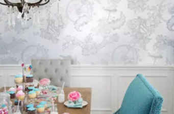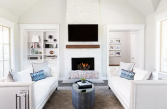 This new construction project in the Hill Country just South of Austin is clean, crisp and transitional. Project highlights include Hickory Chair custom furniture, a faux shagreen oval coffee table, gray linen swivel chairs, a Tibetan lamb lucite bench. The dining area features a playful, foil wallpaper with bicycle illustrations.