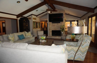 abundant amount of seating. We used soft gray tones with splashes of teal, blues and greens for pop in color.