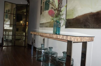 The wood beam ceiling give warmth to this spacious living room while tying in with the beautiful hardwood floors. The furnishings are cozy and inviting providing an