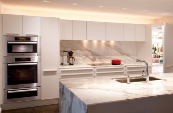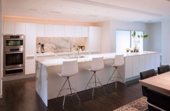 In creating this newly renovated kitchen, it was imperative that all materials, elements, and appliances be clean and elegant, as well as functional and efficient. Miele appliances were utilized to create functional zones in the kitchen while elevating the aesthetic to the open plan design.