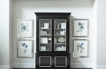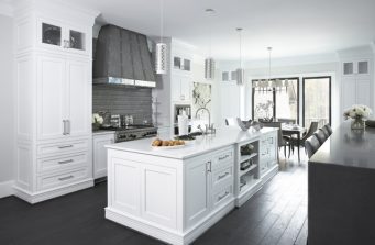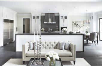 With shades of soft greys and linens, the interior of this home exemplifies sophistication and refinement. Dark ebony hardwood floors contrast with shades of white and walls of pale gray to create a striking aesthetic. The significant level of contrast between these ebony finishes and accents and the lighter fabrics and wall colors throughout contribute to the substantive character of the home. An eclectic mix of lighting with transitional to modern lines are found throughout the home. The kitchen features a custom-designed range hood and stainless Wolf and Sub-Zero appliances.