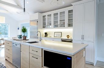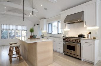 The kitchen was designed to pull your eye in towards the back of the room, with a white rift oak center island and parallel Caesarstone countertops, following the same lines of the newly sanded floors and shiplap ceiling. The kitchen features inset shaker style cabinets, Sub-Zero Wolf appliances, 2×9″ subway tile over the countertops, 2 dishwashers, a microwave drawer, and 36″ integrated refrigerator.