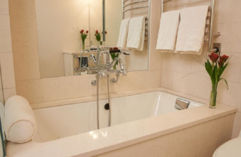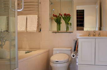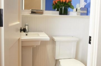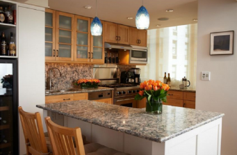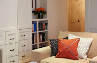 Client lives and works between LA and NYC, and maintains a pied-a-terre that was dated. Hired Robin Wilson Home team to ‘update’ the space with new accents, paint and countertops/backsplash in kitchen (stainless and Silestone). An update to powder room and master bathroom used KOHLER products for faucets/fixtures/tubs/toilets. Silestone used as slab for tile, tub surround and wall cladding in shower. Soothing palette of whites, repainting of built-in furniture and bold accents compliment the neutral walls.