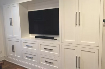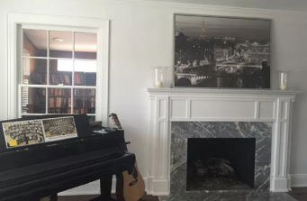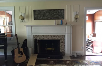 Transitional, wainscoting, custom built-in, custom fireplace mantel, grasscloth wallpaper.
