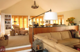 This large addition to the original home posed a great design opportunity with the living space divided into 2 levels by stairs. The resulting design, with its 2 distinct areas separated by custom cabinetry, creates a wonderful entertaining space that accommodates television watching and gaming as you enter the room from the kitchen, as well as a quieter conversation space for adults to gather but not be too far away from the action. The natural lighting and rich patterns and textures complement the outdoor living space that surrounds the room.