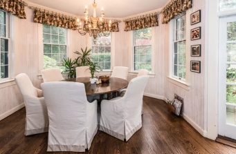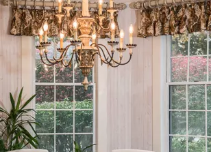 Don’t we all lust for a fabulous kitchen like this? All the gourmet accoutrements, yet functional to prepare for large parties or quiet meals in the eating area. The slipper covered chairs lend a casual air, and their small wheels make access to the very large round distressed table easy. I chose an English documentary pattern for the window treatment fabric, and kept the style short and simple. A gracious chandelier with wood stained in a natural finish and a metal frame keeps consistency with lighting in all three rooms. This kitchen displays a wonderful gathering of my clients collections from his world travels in Italy, England, Holland and France.