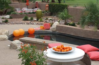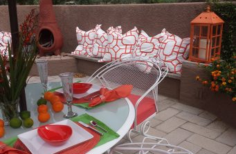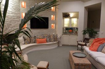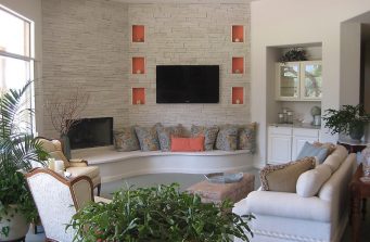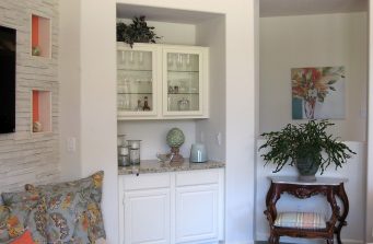 Still on the hunt for the perfect painting for over the fireplace, this room has made the leap from a dated 80’s interior to a stylish stone statement for the future. The angular framed mass that originally housed the TV was eliminated in favor of a curvilinear banco which sweeps along the wall and continues in front of the fireplace as the hearth. White stacked stone was used to face the entire area from the new limestone slab surface of the banco to the ceiling. The new, slim TV is now mounted on the stone wall. The original sheetrock mantle and surround of dark granite were removed in favor of the continuation of the white stacked stone. The bar surface is a new granite slab, the cabinets were painted, the sink removed and the upper cabinets had glass added with lights to provide a display and soft illumination at night. A mirror is due for the space between the upper and lower cabinets. The coral paint in the new lighted niches in the stone wall add “pop” and the color is repeated on another wall across the room.