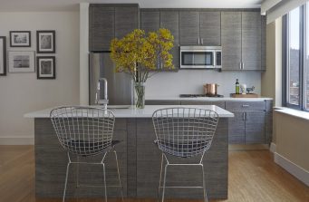 A young, single Wall Street analyst wanted a bachelor’s pad for his two-bedroom unit in a new luxury development in Chelsea. The décor features a palette of charcoal grey and masculine details as well as luxurious handmade Japanese wallpaper.