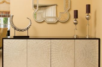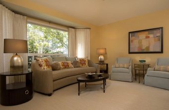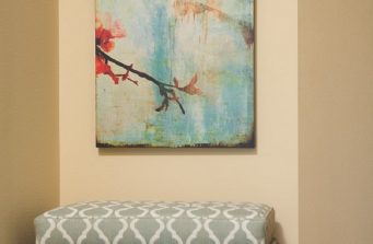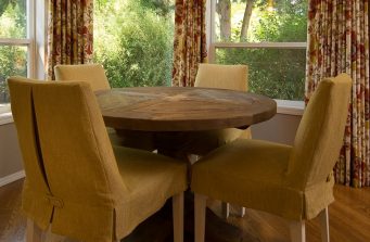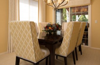 Comfort was key for this retired couple in their new home. We furnished the living room and dining room with an eye toward elegant and supremely comfortable seating in soothing colors of soft yellow and robin’s egg blue.Vibrant colors enliven the family room through drapery, and a custom rug. The generously proportioned sectional features motorized recliners for relaxing TV watching. We remodeled the fireplace to create a warm and inviting focal point. The kitchen dining area was fitted out with a low-maintenance, reclaimed wood dining table and slip-covered chairs to withstand visits from grandchildren. In the master bedroom, custom silk drapery in a rich, gray-violet color and matching wall color surrounds an upholstered bed with sumptuous custom bedding. The guest bedroom contains a gift-wrapping station behind drapery in the closet. And the office is appointed with live-edge desks,leather-look wall coverings, and custom steel shelving to hold a lifetime of precious memorabilia.