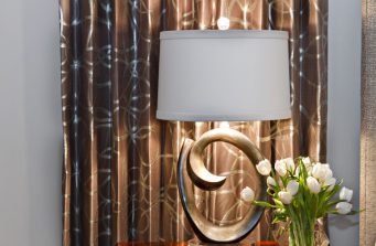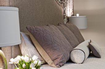 For this space, the homeowners wanted a soothing space to unwind after a long day. I brought in a neutral color palette made rich with texture rather than pattern. I brought in just one pattern- an abstract circle- into the drapery and took inspiration from this for the lamps and quilt. The custom bed was upholstered in a beautiful warm gray chenille with flecks of sparkle. The homeowners wanted to keep their existing nightstands so I chose colors and patterns that worked well with them. Photo credit: Melissa Mobley Copon