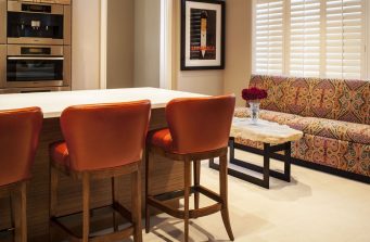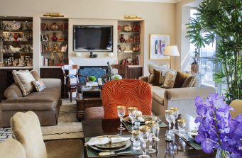 Warm and vibrant hues set the tone for the remodeling of this Beverly Hills condo with Asian influences. It is the juxtaposition of vivid colors, lush fabrics and rich patterns that creates the aura of relaxed yet sophisticated livability for which DLD is known. Add to this the personal touches of artistry in this top interior as expressed in the wall décor and sculptures, both of which are reflective of an Asian sensibility. The decidedly feminine aesthetic, with the multiple curved elements — from jewel-toned vases and ornate frames to the jacquard-upholstered bed and shelf after shelf of built-in shoe storage — the result is a highly individualized interior design that represents the homeowner in the best ways.