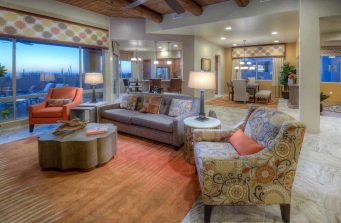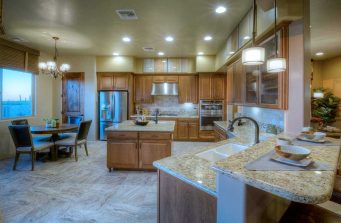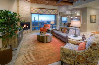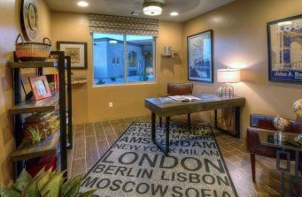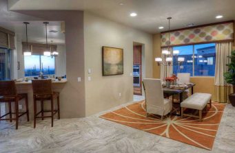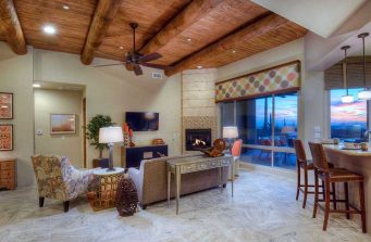 Model Home Living Space with a beautiful view out to the patio and desert sunset beyond. We didn’t want to distract from the views. The fireplace has elegant travertine 12″ x 24″ stone tiles alternating with rows of Ancient Wave Tile, and the surround is entirely composed of the Ancient Wave Tile. The colorful area rug ties the setting all together.