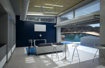 The amenity building was located next to the pool, so the space opens figuratively and physically to water. This idea started to dialog between the exterior and interior spaces and how they can effectively blend together as the doors open and more residents utility the space.