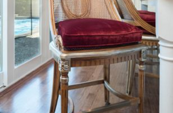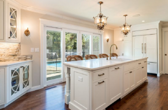 The gorgeous kitchen features white inset cabinets by Crystal Cabinet Works and an eye-catching blue enamel French range by Lacanche. All the details are just right including the French-inspired pendant lights over the island and detailed brass hardware.