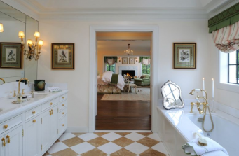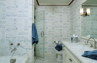 This contemporary condo masterbath was a complete gut and redesign, taking an outdated, chopped up 80s design and turning into a bright, spacious, luxurious spa retreat. Spruce green slab front cabinets conceal hidden features like rollout shelves under the sink along with interior electrical recepticals for appliances to be grabbed and put away with ease. Shower and water closet feature matched side-by-side frosted green glass doors for a chic complement to the cabinets.