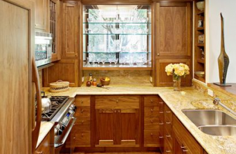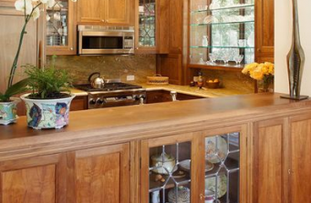 Formerly a 1960’s kitchen, the custom workmanship makes this remodel a delight to work in. Custom glass shelving shows off the owner’s collection of fine glassware. Leaded glass was designed in the same style as a near by antique hutch.