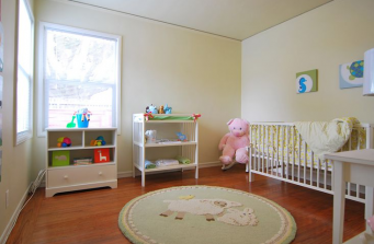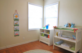 The front entry outside of the house was painted a light blue color with white trim, which was reminiscent of a cottage nearr the ocean, something not too far from reality. My staging inventory includes many coastal and sea-themed décor, so I decided to utilize these items to design the property accordingly. Using this seaside motif, it would also give the home an inviting, relaxing, and airy feel. Keeping the house bright with light, beach colors gave it a sense of openness in terms of space which was very important. Continuing with the pattern, I made sure to create a nursery that was both pleasing to the eye and full of joy!