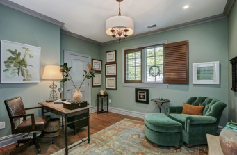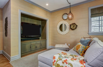 This luxury apartment was completely transformed to reflect the style of the new owner; wood floors refinished, traditional white mantel removed and stone with reclaimed mantel added, fresh paint, closets in bedrooms redesigned to house built-ins adding function to each room, powder room makeover with new plank style porcelain floor and subway walls, and all lighting swapped out to LED. Many of the existing furniture pieces were reused. New window treatments added throughout including woven shades, shutters, linen panels and flat roman shades. We are continuing our journey into the master bath room this year.