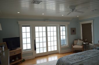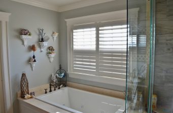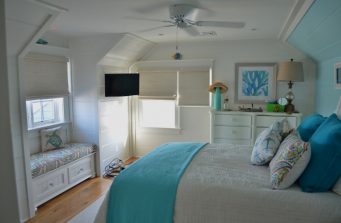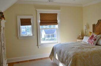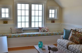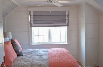The new home had much larger windows to fully enjoy the magnificent ocean view. As the windows are east facing, they needed blackout shades so they could sleep in on lazy summer days. We decided on motorization for the larger windows, but the clients didn’t like cassettes or valances. As they brought me in early in the construction phase, I worked with their builder to create a cohesive design that blended seamlessly with their nautical décor and shiplap detail. The ultimate solution to hide the shades were custom designed cornices built into the trim.