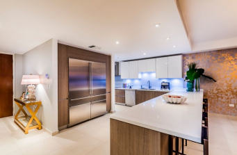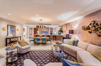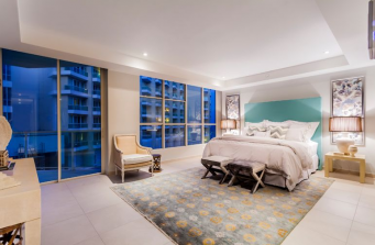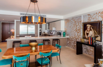 Our designs are always a mixture of new and vintage pieces. A mixture of contemporary furniture with a great art deco vintage pieces such as the dining table from Chicago’s 1950s. The stunning wallpaper that covers the space serves as art on its own. It takes the gold metallic tones into a 3 dimensional feel. The two bedrooms are transformed into zen areas with soft colors and luxury in mind.