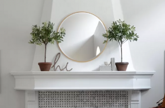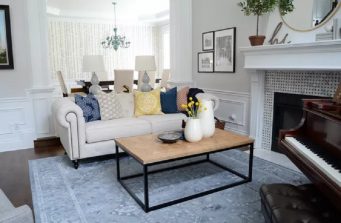 Beautiful living room with cream tufted sofa, patterned pillows, hardwood floors, navy blue area rug, accent chair, fireplace.