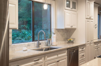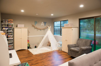 For this project, the goal was to open things up. There were walls everywhere and you couldn’t see from one side of the room to the other. This was a problem for the homeowner as she also operates an in home daycare for small children. By opening up the walls that surrounded the central kitchen, the downstairs became one large room. We added a half wall at the end of the kitchen space to separate the daycare area from the home but added some fun, bright details.