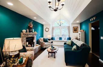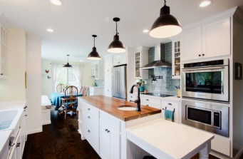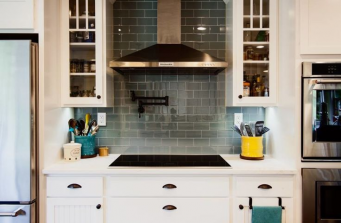This project was a culmination of creating better function while also maintaining the homeowners very vibrant personality. They had a need to create a much larger kitchen for themselves, kids, and grand-kids, and to keep the overall feel of each adjoining space inclusive to the next. The homeowner had a deep love of color that originally felt like it took over the space. We kept the teal and toned down the yellow to a soft, pale yellow to let the white and teal be the focus. The dark hardwood anchors each room and creates flow. The central island adds much needed counter space while also adding visual texture with the walnut top. Bronze details, grey blue glass tiles, and their own furniture help to really make these new spaces feel like their own.