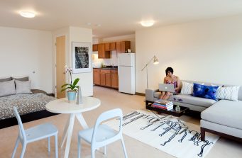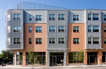 This 40,000SF mixed-use project for the Jamaica Plain NDC was developed as a sustainable, Transit-Oriented Development adjacent to the Jackson Square T Station and the Southwest Corridor Park. The program includes retail and office space at the street level and affordable housing on the upper three floors. The façade has a rhythm of multi-story corrugated metal bays that break the building massing, and relate to nearby houses. Facing Jackson Square, the corner bay is curved, with a prow above of vegetated screen. The brick exterior at the streets gives way to fiber-cement clapboard at the rear. With a high performance envelope and energy efficient systems, it meets Energy Star and LEED standards. The design includes passive solar strategies: the long elevations face north and south, and natural light and ventilation are maximized with large operable windows. The roof is planned to incorporate a photovoltaic array providing electricity to the building, and drought-resistant vegetation to reduce the heat island effect.