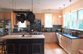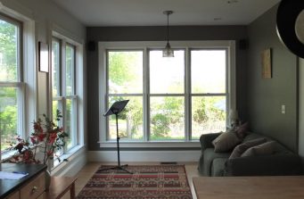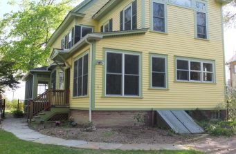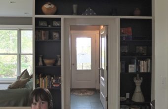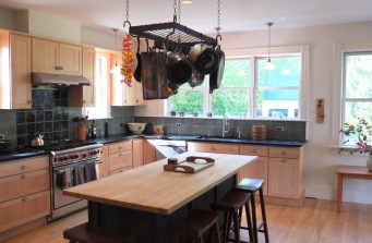 When former clients left a small rural bungalow and moved to a larger in-town house to better accommodate the needs of their growing family, they found that while they loved the new house and location, the kitchen didn’t work for them. Small and dark with poor quality cabinets and appliances, it was not livable. Worse, there was no relationship to the outdoors. The East wall, which could have looked out on the gardens, had no windows. The south windows, overhung by a deep porch were always in shadow. And in winter, the entry, open to the elements, blasted cold air into the space.