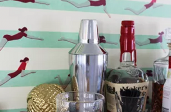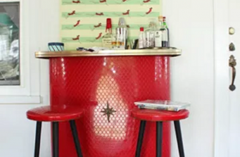 An original mid-century dry bar became the inspiration for this space, which includes small seating and dining areas. Nautical touches, along with a red, white, blue, and yellow color scheme create a bright, playful space that is fresh and modern with vintage charm.